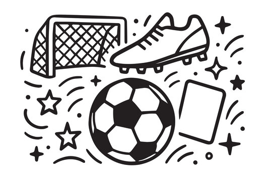 Vector background with soccer sports theme in black and white, outlined in bold black lines, ideal for event posters, banners, and advertisements.