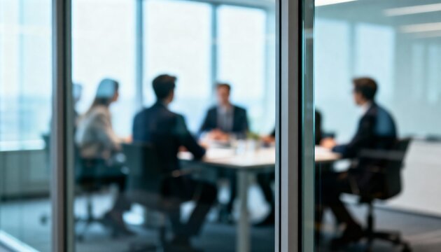 Blurred Business Meeting Behind Glass Partition - For corporate backgrounds and confidentiality themes