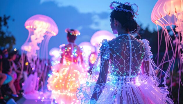 Women in glowing jellyfish-themed LED dresses walk in a colorful night parade, surrounded by illuminated jellyfish decorations and vibrant lights.