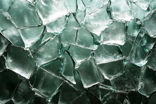 This image presents a detailed close-up of shattered glass, creating a textured pattern that evokes themes of destruction and elegance, highlighted by green hues.