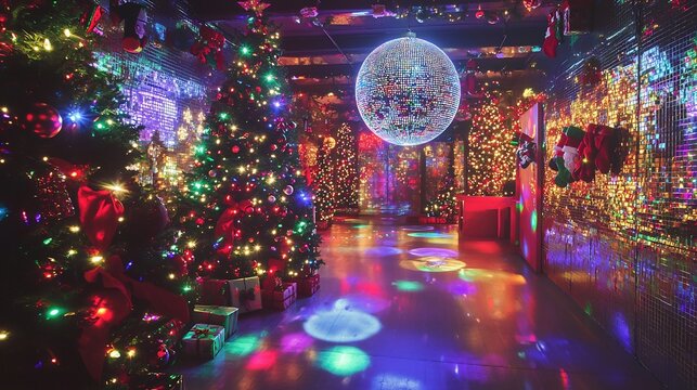 Christmas themed party with a giant disco ball festive decorations and holiday lights reflecting off the walls creating a magical dance floor