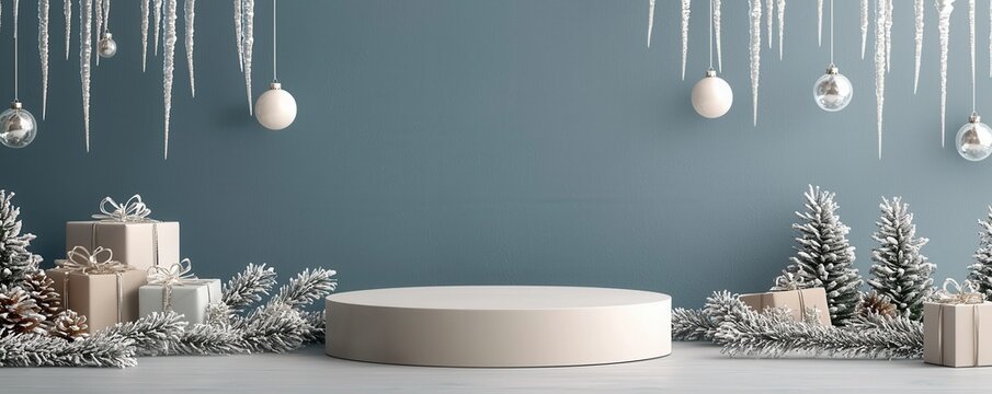Elegant winter scene featuring a minimal display stage, gift boxes, and festive decorations for holiday themes.