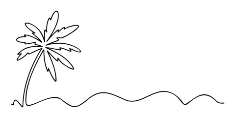 Minimalist black line drawing of a tropical palm tree standing on a wavy ground representing sand or an ocean shore, ideal for summer vacation promotions and travel themed graphics.