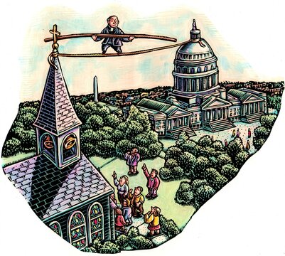 Theocracy as a problem that makes life harder - symbolized by a person pushing weight with word Theocracy to show that Theocracy can be a burden that is hard to carry, 3d illustration