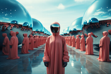 The world is devastated by pollution. A member of future society dressed in a pink protective robe with a hood and a face shield visor is standing, surrounded by silver reflecting spheres.