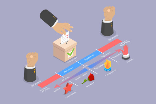 3D Isometric Flat Vector Illustration of Political Spectrum, Types of Governments, Political Power Forms