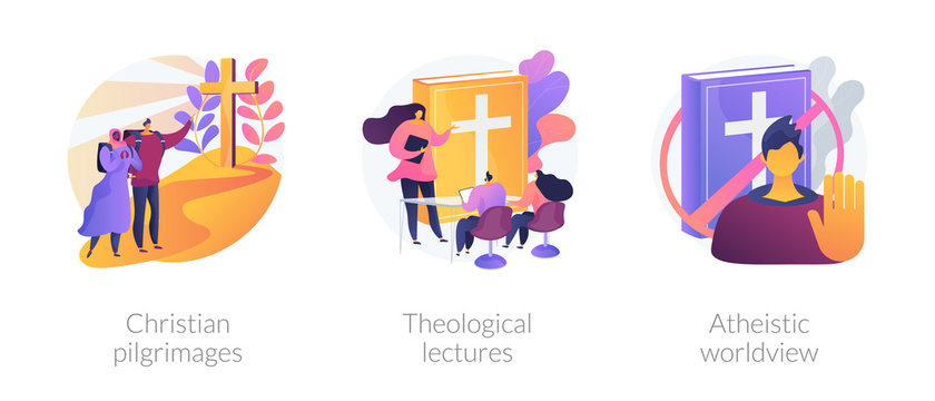 Study of god abstract concept vector illustration set. Theology and holy bible, christian event, theological lectures, sunday school, church priest, sunday mass, pilgrimage abstract metaphor.