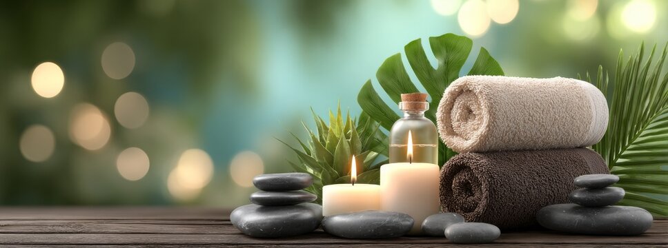 Candles emit a soft glow in a calm space surrounded by smooth stones and a rolled towel creating a serene atmosphere ideal for relaxation and self care.