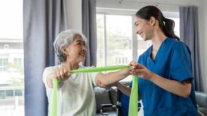 asian female caregiver assisting senior woman with physical therapy exercise at home during rehabilitation process to improve mobility strength and overall health care support in daily life