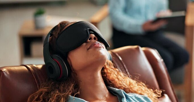 Calm, therapy and woman with sound in headphones at clinic on psychedelic treatment for ptsd or depression. Audio, frequency and patient in psychology study for research on anxiety and mental health