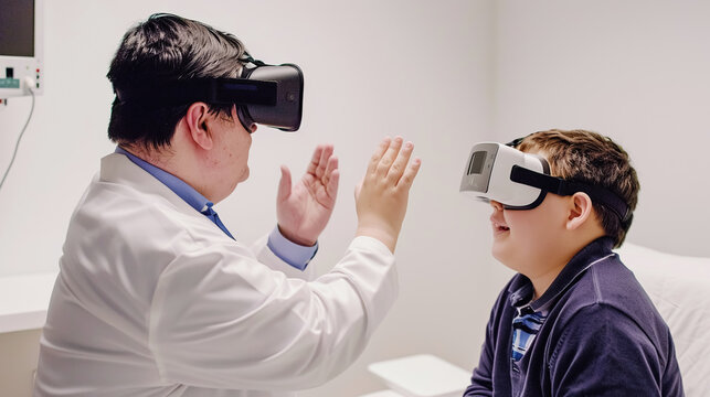 A boy is engaged in virtual reality therapy under the supervision of a doctor. New modern technologies in pediatrics