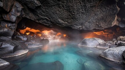 Wide shot of geothermal cave with glowing orange rocks and blue steaming water pool. Natural lava tube hot spring environment for thermal relaxation and adventure exploration concept.
