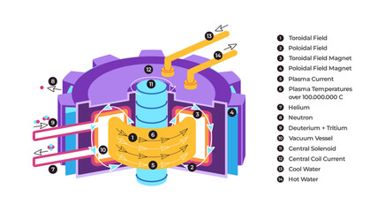 Tokamak thermonuclear fusion reactor including toroidal and poloidal fields plasma magnets and fuel showcasing the process of controlled thermonuclear fusion labeled illustration