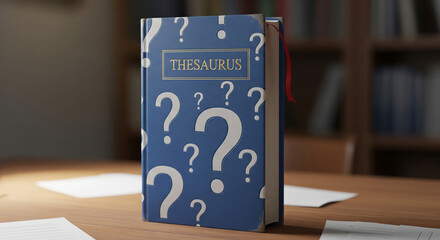 Blue thesaurus book with question marks on desk
