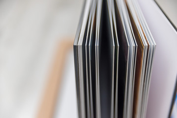 Close up of thick and rigid wedding album pages in a book with acrylic cover