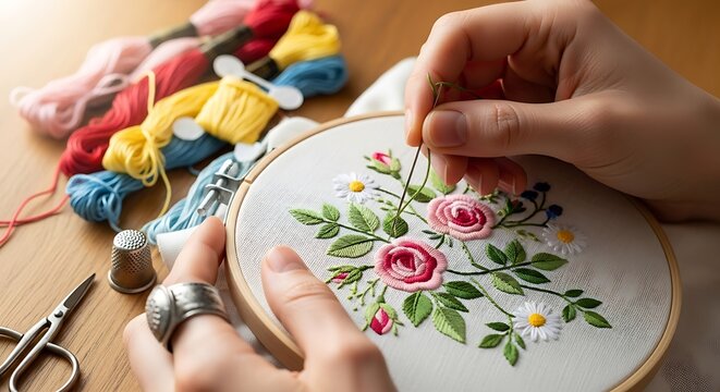Detailed close-up capturing a needlework project with floral embroidery