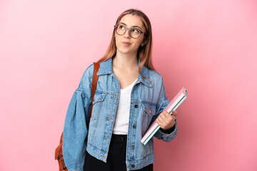 Young caucasian student woman isolated on pink background and looking up
