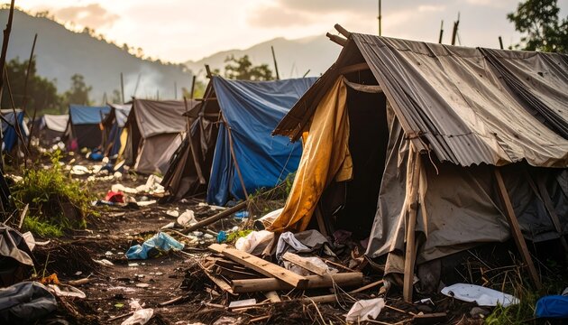 Makeshift Refugee Camp at Sunset: Temporary Shelters for Displaced People Amidst Hardship