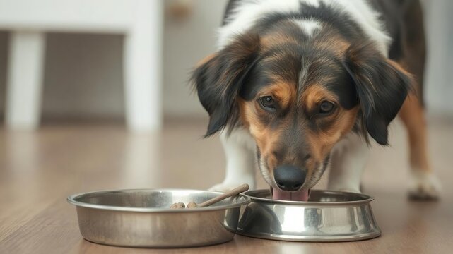 Hungry or thirsty dog fetching metal bowl for food or water, metal bowl, water, feed