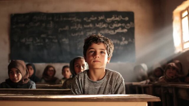 Focused Learning: A young student in a rustic classroom, gazing ahead with a contemplative expression, embodying dedication and a thirst for knowledge in the face of educational challenges.