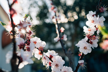 magnolia tree blossom in springtime. tender pink flowers bathing in sunlight. warm april weather