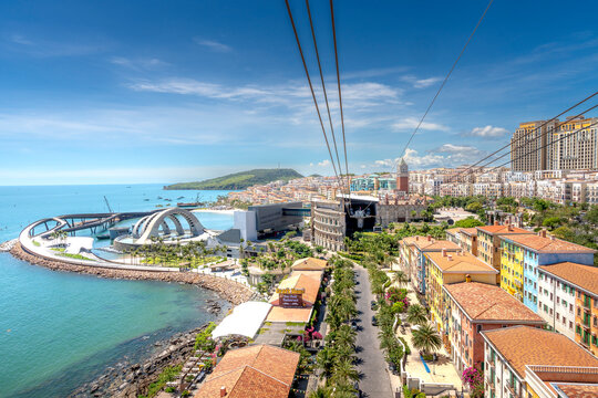 Phu Quoc Island, Kien Giang Province, Vietnam - April 29, 2024: Sun World Hon Thom Nature Park, reached by cable car across the sea from Phu Quoc Island, Vietnam, Southeast Asia.View from above