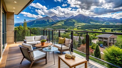 Modern apartment balcony overlooking the breathtaking Rocky Mountains in Colorado, with a sunny patio set and scenic vistas of the surrounding landscape.