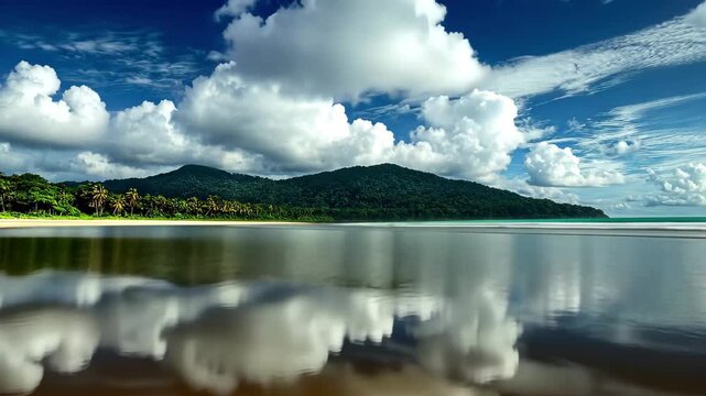 Beautiful clouds reflect in the calm waters of Thornton Beach in Queensland, Australia, Struck island on Thornton beach in Queensland Australia Visit Daintree park