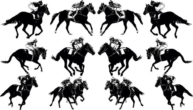 Super slow motion close up of horse racing tournament with jockeys sprinting running thoroughbred stallions to lead on finish with dust explosion in sunshine.