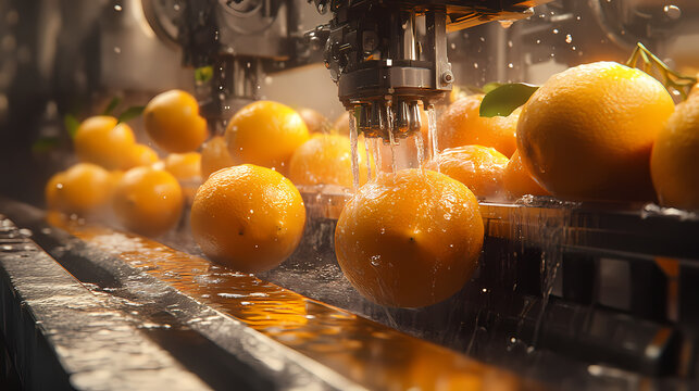 Citrus fruits being thoroughly washed and cleaned on a modern production line in a food processing facility. [Mechanical Forests] | Clockwork Orchards | mechanical fruits. Illustration