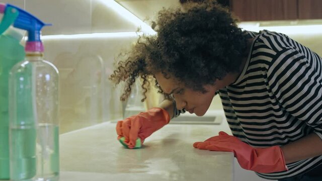cute young woman in yellow gloves spraying detergent spray while wiping dust off from the kitchen wall with a rag thoroughly