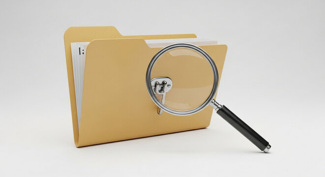 Thoroughly examining important documents within a file folder using a magnifying glass, symbolizing in depth analysis and data discovery for business.