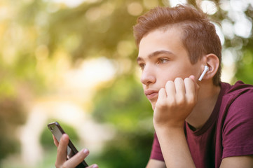 Close-up portrait of a thoughtful unhappy teenage boy with smartphone, outdoors.  Sad teenager with mobile phone looks away, in the park.  Pensive teenager in casual clothes with cell phone in park