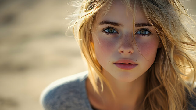 A young girl with beautiful blonde curls gazes thoughtfully at the camera. Soft morning light fills the room, highlighting her delicate features and serene expression.