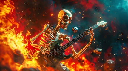 Skeleton shredding on electric guitar in a fiery stage, thrash metal, vibrant colors, dynamic pose, 3D