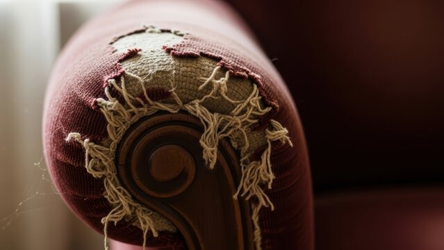 Close-up of the worn and frayed arm of a vintage red armchair.