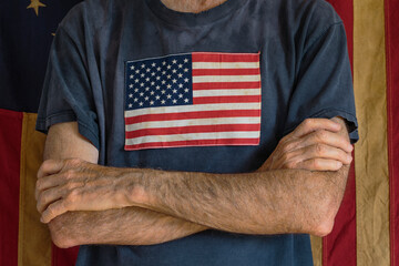 Senior man in faded, threadbare tee shirt with an American flag