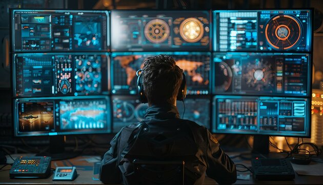 Cyber Threat Detection: Vigilance in Action, cyber threat detection with an image showing a cybersecurity professional monitoring screens displaying real-time alerts and threat indicators, AI