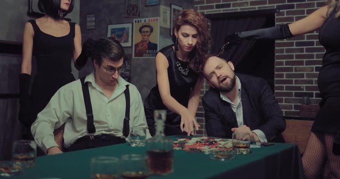 Beautiful women rob men. Girl takes all the chips and money, others threaten the men with a pistol.