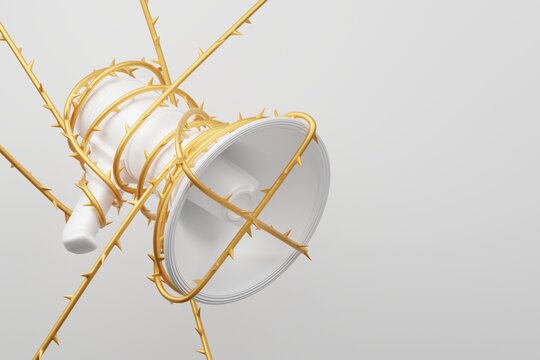 White Megaphone with golden wiggle vine thorn 3D rendering, Protest against Elite dictatorship threaten censored press concept poster and social banner horizontal design background with copy space