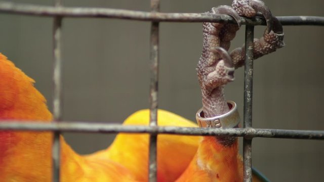 A Sun Parakeet or Sun Conure clinging on to its cage with a tracking ring on its leg, the importance of protecting exotic animals threatened by illegal pet export and trade.