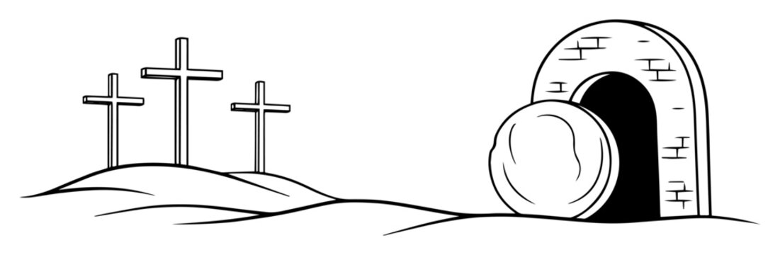 empty tomb and three crosses on hill – minimal easter resurrection vector