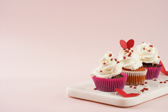 Three homemade white and chocolate muffins with red frosting and heart-shared red and white sugar decoration on marble board on pink surface