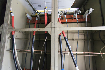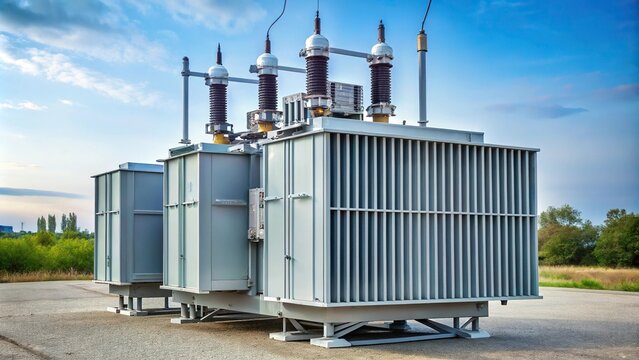 Electrical equipment in outdoor power substation, two three phase oil immersed transformers