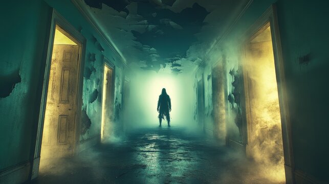 Eerie hallway with shadowy figure illuminated by glowing doors and misty atmosphere perfect for horror mystery thriller supernatural and cinematic scenes