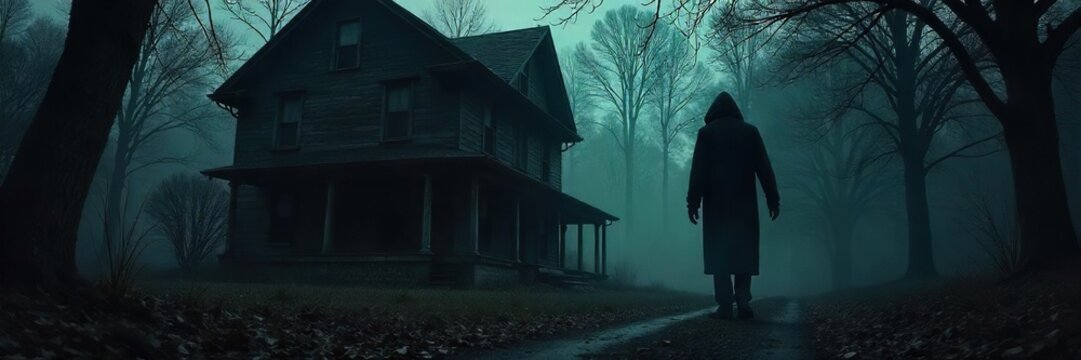 A shadowy figure lurking in a dark, dilapidated house, its presence felt more than seen; a chilling atmosphere of suspense and dread pervades the scene , mystery, gothic