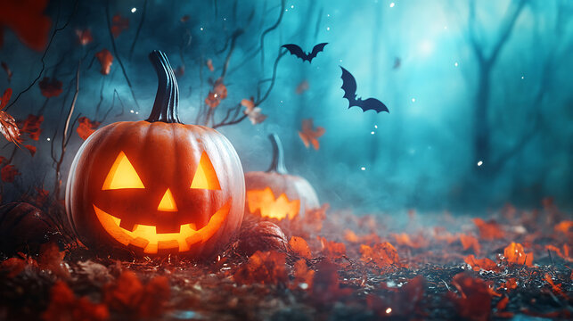 A menacing carved pumpkin with glowing eyes and mouth sits on the forest floor at night, surrounded by mist and fallen leaves, creating a chilling Halloween atmosphere