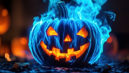 Halloween pumpkin with spooky lighting and text overlay