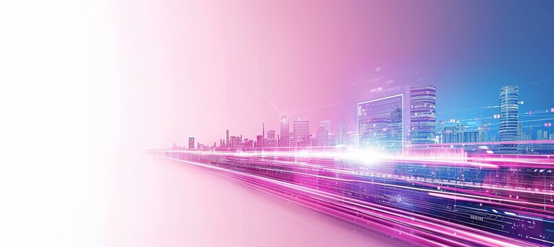 Vibrant neon cityscape with futuristic skyscrapers, dynamic light trails, and pulsating energy