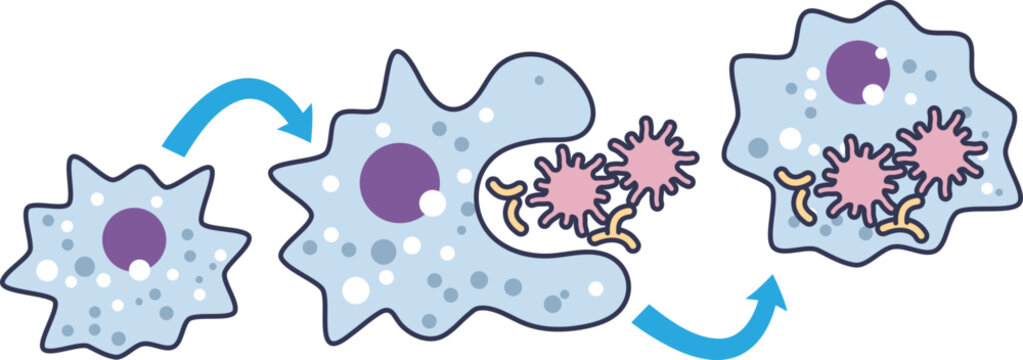 A diagram of a macrophage performing phagocytosis. The cell engulfs and digests blood clot components, illustrating the biological process of thrombus resolution and immune response.